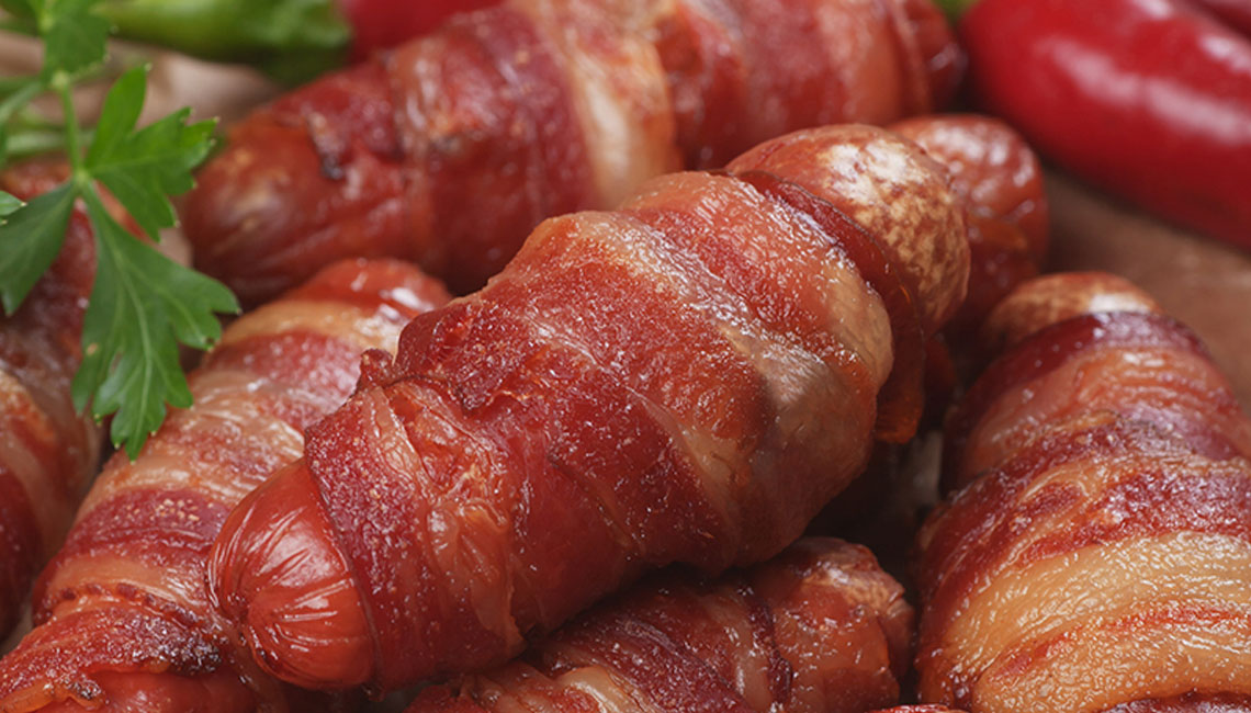 - Wrap one piece of bacon around each sausage.