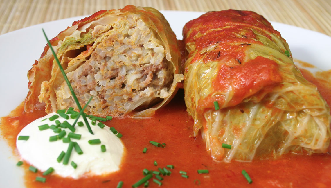 - Roll cooked cabbage leaves around each sausage and place in a 1 ½ quart baking dish.